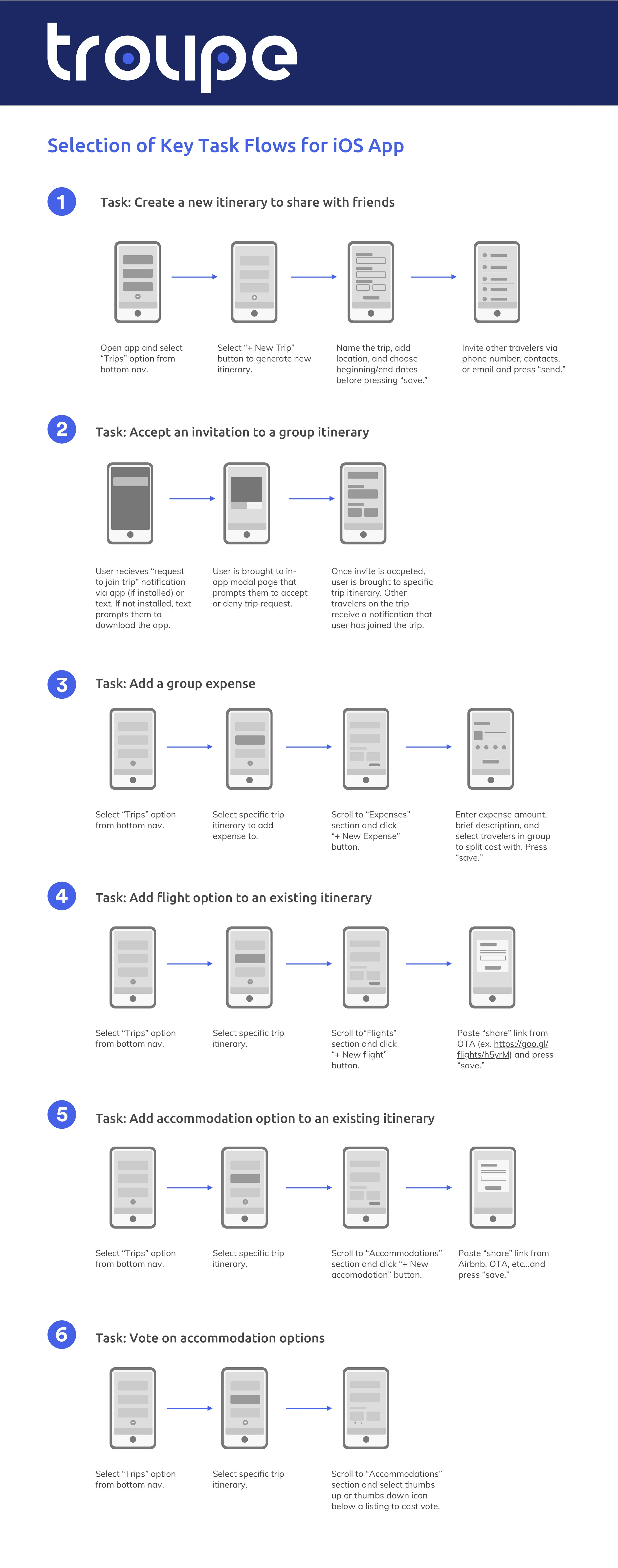 Before moving into the first phase of wireframing, 6 key task flows were identified that would be critical to a successful user experience within the app: